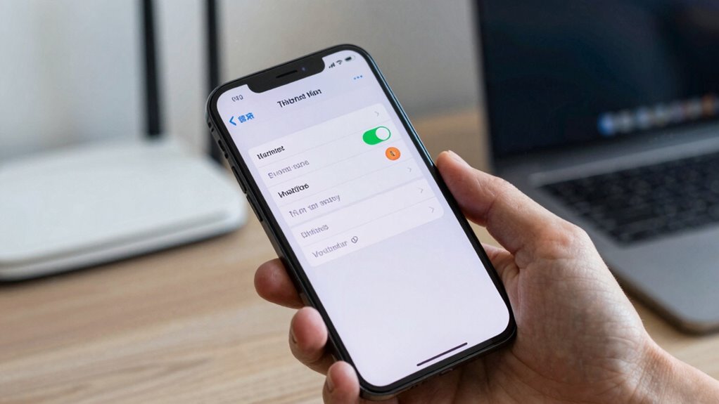 To fix connection issues, start by checking your iPhone’s Wi-Fi, Bluetooth, and USB settings to guarantee everything’s enabled and properly configured. If problems persist, resetting your network settings can often resolve underlying glitches. This step helps clear any misconfigurations that might be blocking your hotspot connections.