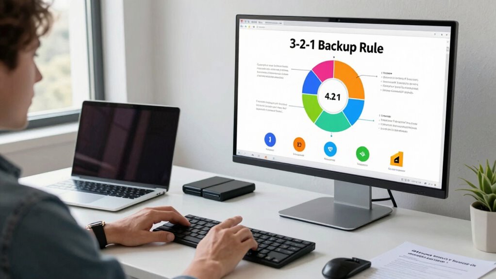 The 3-2-1 Backup Rule means you keep three copies of your data — two on different local devices like external drives or NAS, and one off-site, such as in the cloud. This setup helps protect your files from hardware failure, theft, or disasters. Make sure to secure your backups with encryption and verify they work by testing restores regularly. If you want to learn how to implement and maintain this system effectively, there’s more to explore.