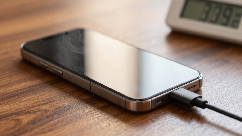Ambient temperature directly impacts your phone’s heat during charging. When it’s too hot or cold, thermal management becomes less effective, causing your battery to heat up more than usual. This excess heat accelerates battery degradation over time, risking damage. To keep your phone cool, avoid charging in direct sunlight or extremely cold environments, and guarantee good airflow. Proper thermal management helps maintain ideal charging temperatures and extends your battery’s lifespan.