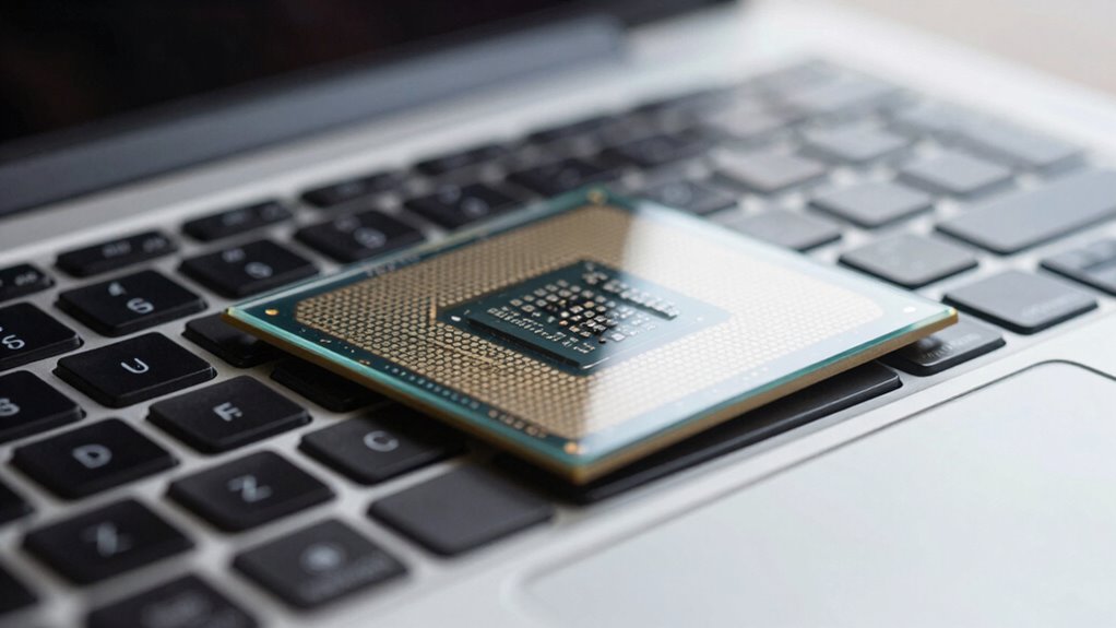 While power efficiency shapes the design of mobile CPUs, performance capabilities often differ considerably from their desktop counterparts. Mobile CPUs prioritize battery life and thermal management, which typically means lower clock speeds and fewer cores compared to desktop CPUs. This results in less raw power but better energy efficiency, allowing your laptop to run longer between charges. Desktop CPUs, however, are built for sustained performance, with superior thermal management systems that enable higher clock speeds and more cores without overheating. When comparing specs, pay attention to these differences: a mobile CPU might seem comparable but could underperform in demanding tasks, while a desktop CPU offers the power needed for intensive workloads. Recognizing these distinctions helps you choose the right CPU for your needs.