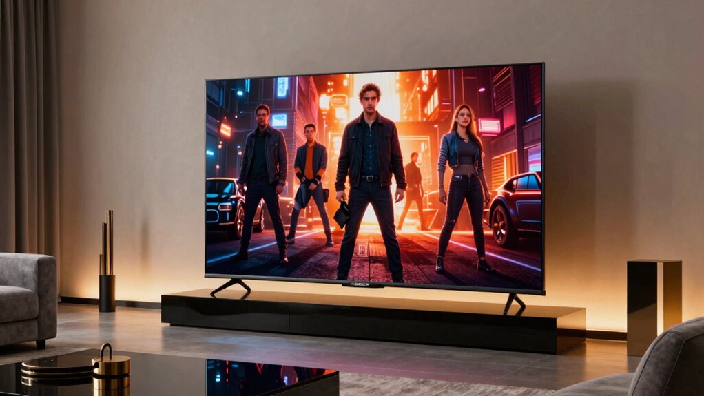 When choosing a 65-inch 4K TV for movies, understanding gaming performance metrics is vital because they directly impact picture quality and responsiveness. A high native refresh rate of 120Hz or more guarantees smoother gameplay, especially during fast-paced scenes. Support for variable refresh rate (VRR) technology helps reduce screen tearing and stuttering, providing a more seamless experience. Low input lag, typically under 20 milliseconds, is essential for responsive gaming, giving you a competitive edge. HDMI 2.1 ports enable features like Auto Low Latency Mode (ALLM) and 4K at 120Hz, optimizing gaming performance. Additionally, a high contrast ratio combined with local dimming enhances dark scene clarity, boosting immersion. These metrics make a significant difference in both gaming and movie viewing, guaranteeing the TV performs at a high level in both areas.