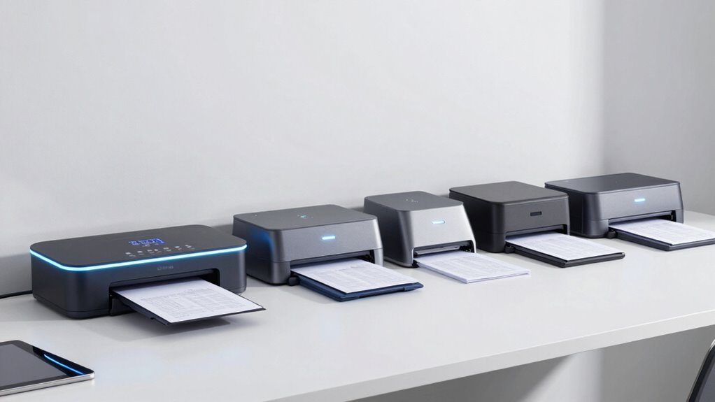 Are you confident your scanner will work seamlessly with your existing devices and software? Ensuring compatibility starts with checking if it supports your operating system—Windows, Mac, or Linux—so it integrates smoothly into your workflow. Wireless options like Wi-Fi or Bluetooth provide flexible pairing, making it easy to connect without clutter. If you prefer wired connections, verify the presence of USB or Ethernet ports for stable data transfer. Compatibility with document management or cloud storage apps you use daily is essential, so confirm these integrations. Additionally, multi-device connectivity can be a game-changer if multiple users or workstations need access. Taking these factors into account guarantees your scanner will fit into your setup effortlessly, speeding up your scanning process and reducing technical hiccups.