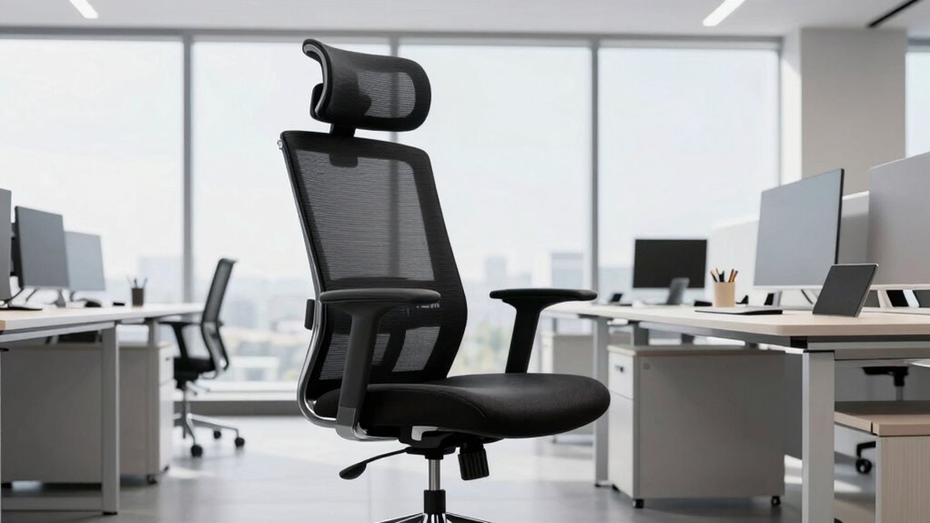 Choosing an ergonomic office chair with adjustable seat height is essential for tall individuals because it allows you to customize the seating position for maximum comfort and support. A height adjustment range of at least 4 inches is ideal, making certain you can set the chair so your hips align with your knees, promoting better ergonomics. Proper seat height keeps your feet flat on the floor, reducing pressure on your thighs and improving circulation. It also helps prevent lower back strain by enabling you to maintain a healthy posture throughout the day. Look for chairs with a pneumatic or gas lift mechanism, as they provide smooth, effortless adjustments tailored to your needs. This flexibility ensures you stay comfortable and supported, no matter your height.