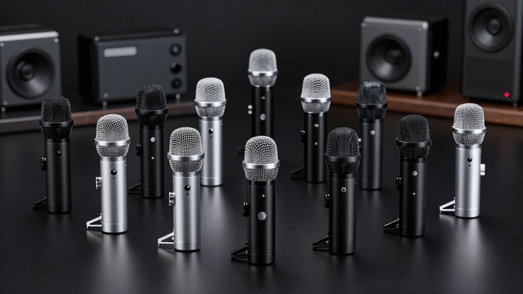 Microphones vary vastly in voice clarity and coverage. I’ve found that condenser mics typically provide crisp, clear sound, while dynamic mics excel in noisy environments. Wireless range also differs—some boast impressive distances, perfect for roaming, while others have limited reach. Ultimately, I consider both audio quality and range, matching the mic’s strengths to my specific needs, ensuring I get the best sound whether I’m recording indoors or capturing on the move.