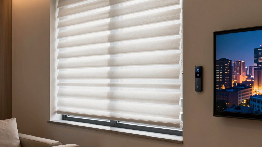 Typically, the battery life for motorized smart blinds ranges from six months to two years, depending on usage and the type of batteries used. I find that models with energy-efficient motors and rechargeable batteries tend to last longer. Regularly checking and replacing batteries helps guarantee smooth operation. Some advanced systems even feature low-battery alerts, so you’re never caught off guard and can keep your blinds functioning seamlessly.