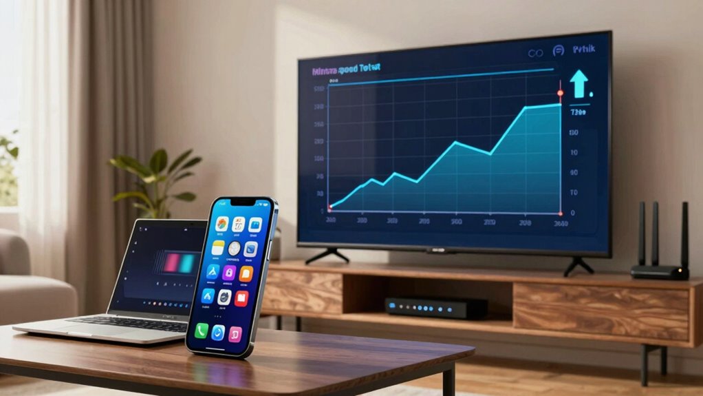 Even if your internet speed test shows high download and upload rates, your apps can still feel sluggish. One common reason is the impact of cloud streaming services, which can consume bandwidth even if your speed test appears strong. These services often prioritize their traffic, potentially slowing down other app functions. Additionally, using a VPN can affect your app performance. While VPNs enhance security, they can introduce latency and reduce effective speeds, especially if the server is far away. This impact isn’t always reflected in your speed test results, which often measure raw bandwidth rather than real-world performance. So, even with excellent speeds on paper, cloud streaming and VPN impact can cause your apps to lag or feel unresponsive. Understanding digital concepts like bandwidth management can help you better diagnose why your connection feels slow despite good speed test results. Being aware of network optimization strategies can further improve your overall experience.