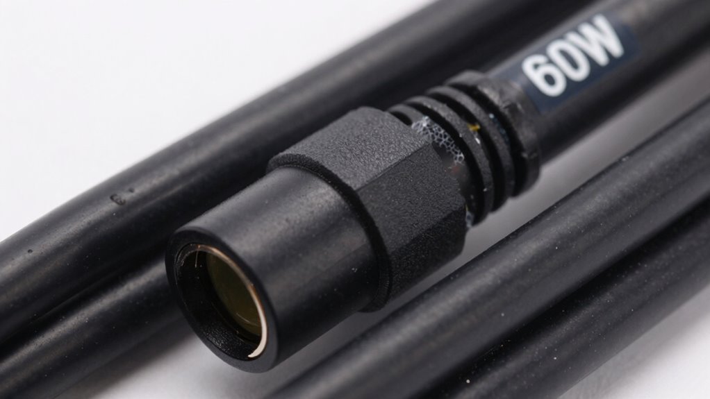 Ever wonder what those numbers like “60W” and “100W” really mean on cable power labels? These figures indicate the maximum power the cable can safely handle, which is key to understanding cable durability. If you use a cable beyond its rated wattage, it can overheat or wear out faster, compromising safety and longevity. Manufacturers often include these numbers to guarantee branding accuracy, showing their product’s capacity and reliability. When you see “60W,” it’s a reminder to match your device’s power needs with the cable’s limit to avoid damage. Properly labeled cables help you make smarter choices, guaranteeing your equipment runs smoothly without risking safety or reducing the cable’s lifespan. Always respect these ratings for peak performance and durability. Understanding power ratings is essential for ensuring you select the right cable for your specific needs. Regular maintenance and proper filter care, as outlined in a reliable guide, can also extend the lifespan of your equipment and ensure optimal performance. Additionally, understanding cable specifications can help prevent potential hazards and ensure you select the right cable for your needs. Being aware of power handling capacity helps users avoid overloading cables and ensures safety during use.